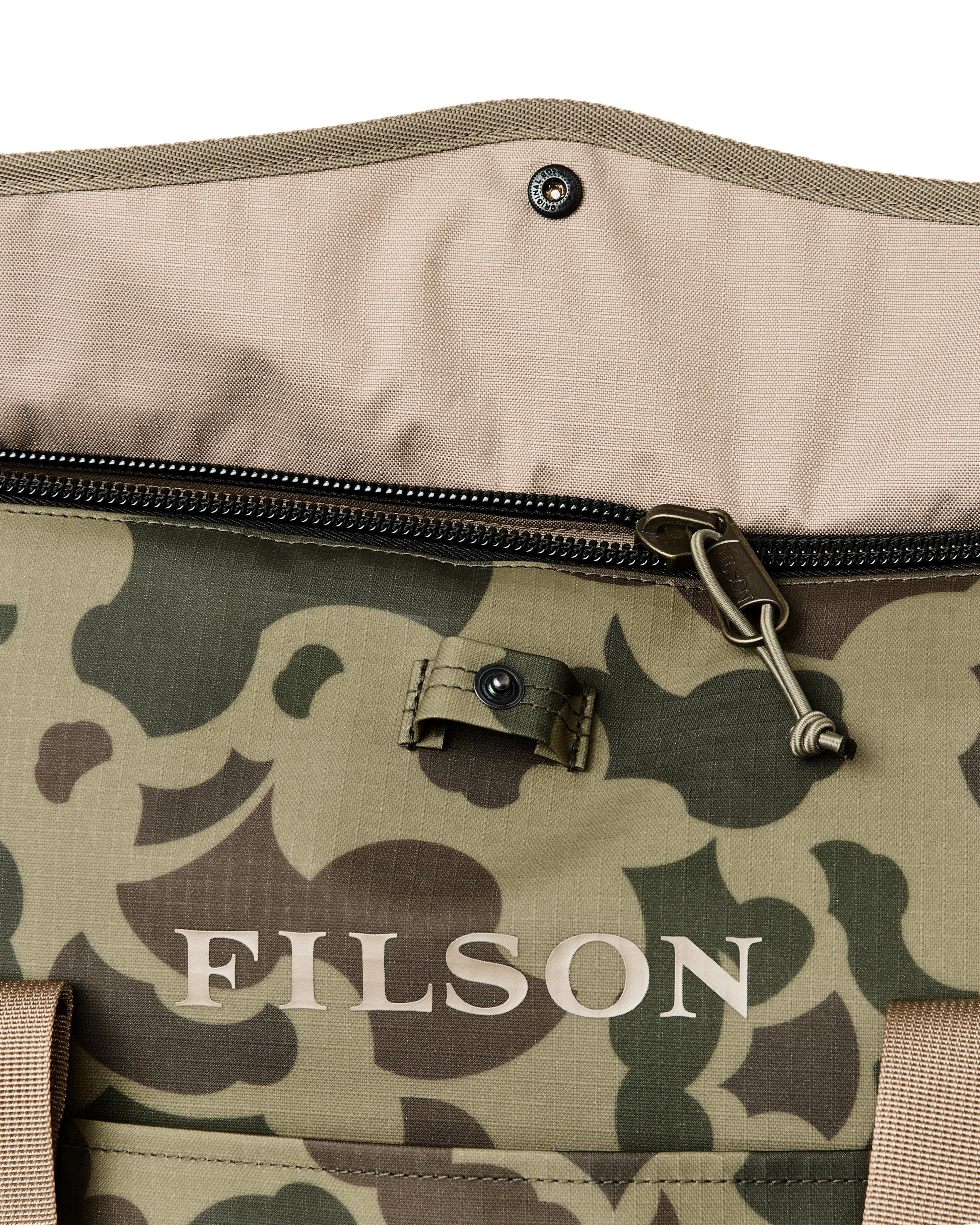 A water-resistant tote made from TPU-coated nylon with a zippered closure and webbing handles. Top zipper is covered by a snap-secure flap for added water protection. Padded bottom panel to protect gear. Padded interior laptop pocket and front stow pocket.