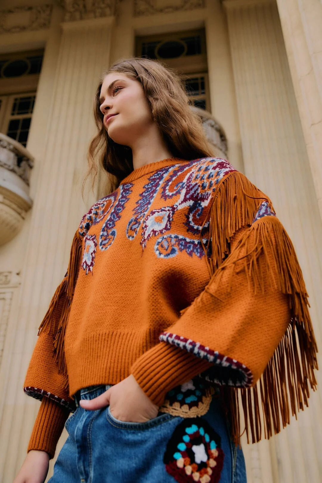 Wrap yourself in the cozy embrace of the Brown Arabesque Scarf Fringe Cuffed Knit Sweater by FARM Rio. Featuring a rich, earthy brown tone adorned with intricate arabesque patterns, this high-neck knit offers a playful yet elegant silhouette. Delicate fringe detailing along the scarf-inspired collar and softly cuffed sleeves add movement and charm, making it a warm statement piece that invites comfort and vibrant style into your everyday wardrobe.