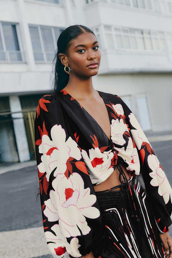 This Black Peony long sleeve blouse is crafted from 100% LENZING™ ECOVERO™ fibers, this blouse offers an eco-conscious choice with up to 50% reduced emissions and water usage compared to standard viscose. It features a V-neckline, a button closure at the back, and front ties finished with beaded tassels. The design includes long sleeves for a refined look.