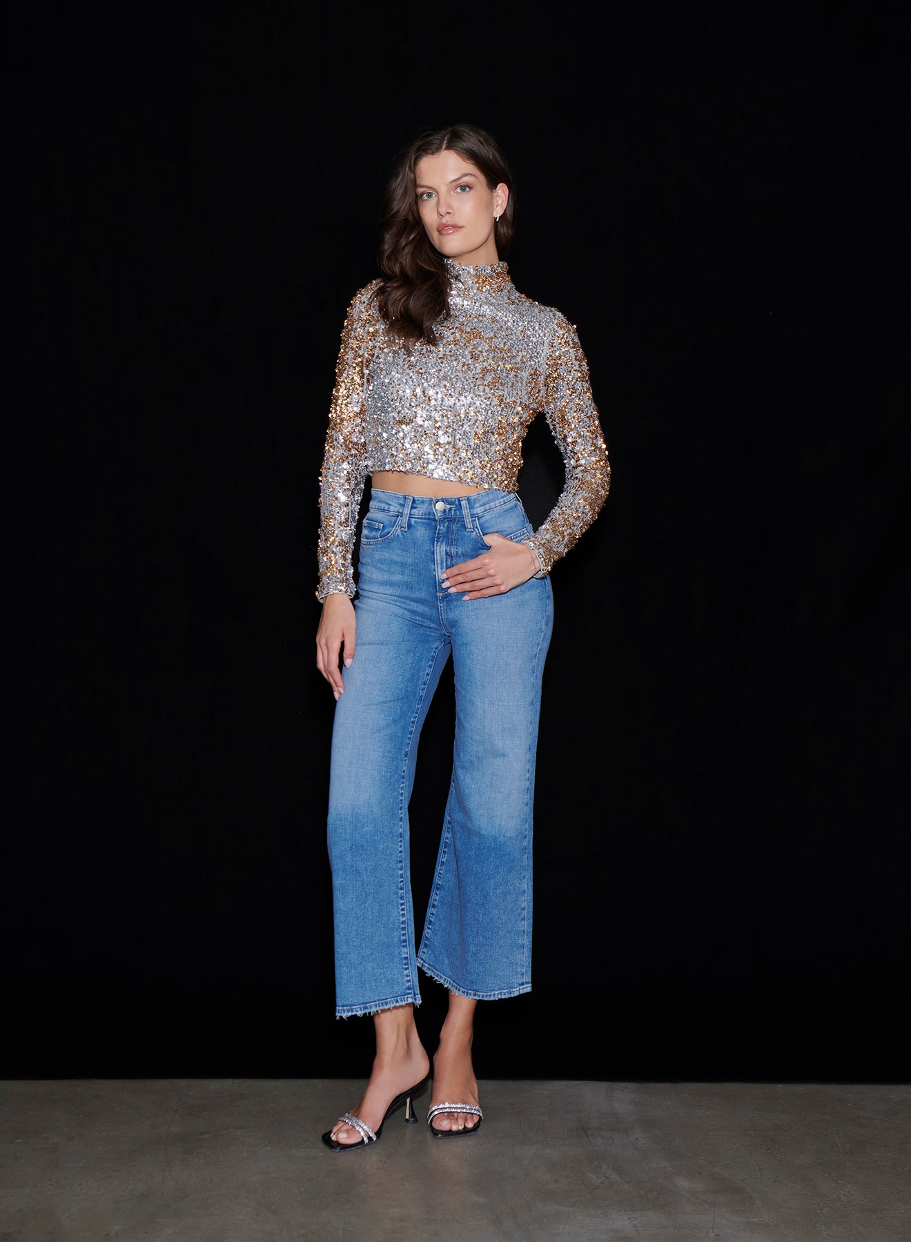 Add a little confetti to everyday! Our Brigitta top is your new stand out, the turtle neck style top is covered in silver and gold sequins. With a simple silhouette and high neckline, Brigitta is the chic addition your holiday wardrobe needs. The slightly cropped silhouette and keyhole detail on the back add a sexy touch. Style with trousers for a chic, holiday ready look.