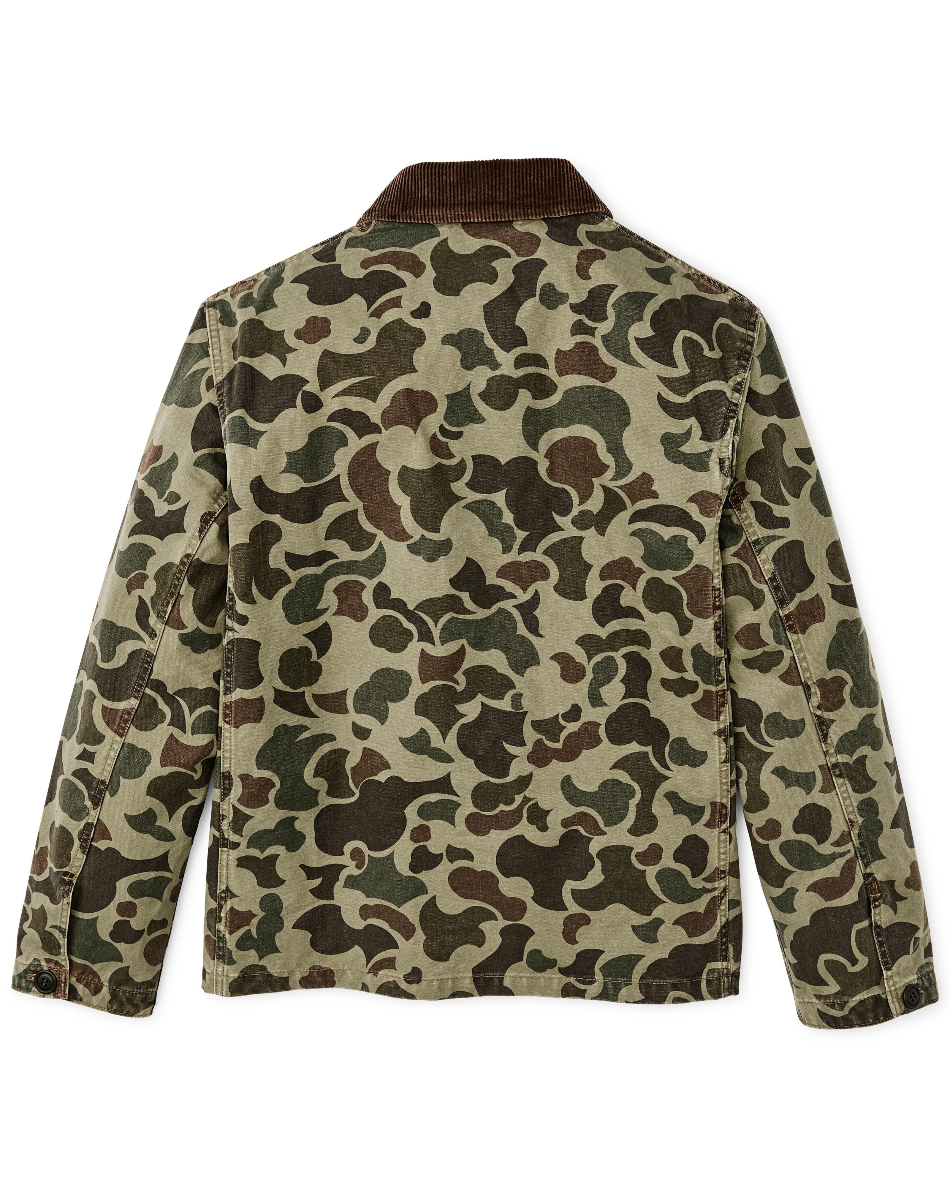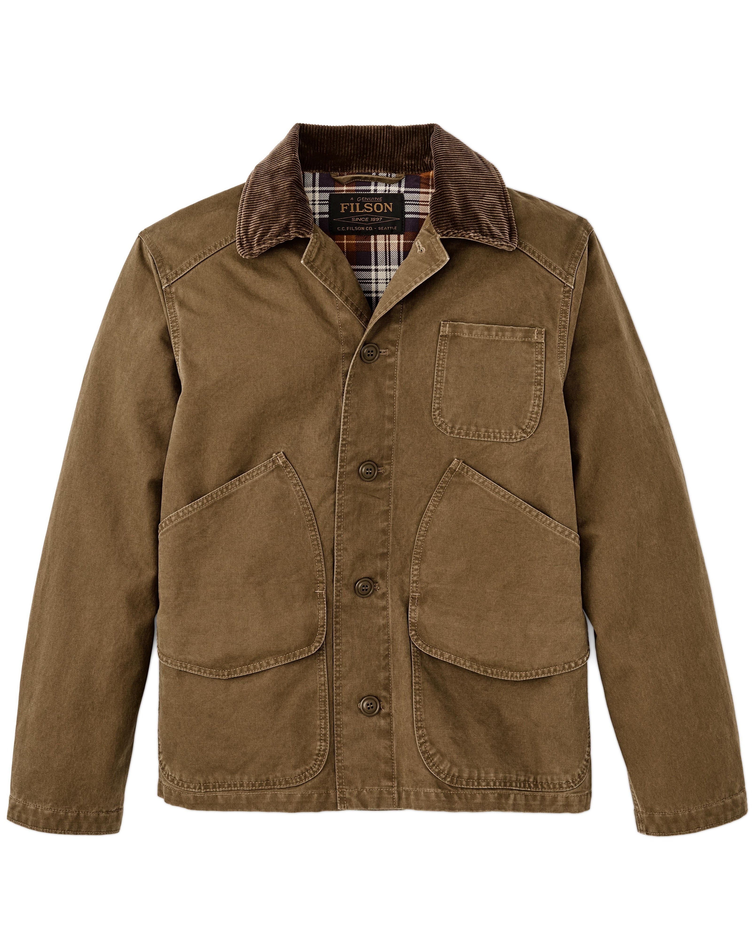 A classic unlined barn coat made with strong cotton canvas. Hand pockets are layered over cargo pockets, a design from vintage Filson hunting coats. Open-stow chest pocket. Corduroy-lined collar.
