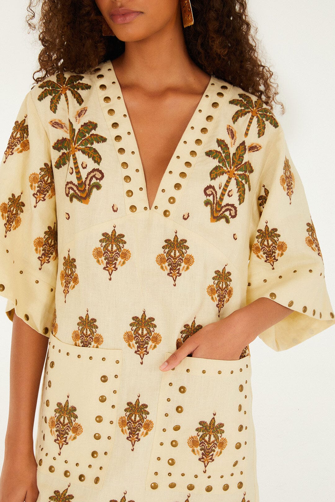 Embrace the vibrant allure of the sand coconut tree tapestry euroflax™ premium linen mini dress by FARM Rio. Crafted from responsible materials, this exquisite piece features a playful tapestry print, drawing you into a tropical paradise. Its v neckline adds an elegant touch, while the flowing mini silhouette evoking a sense of carefree femininity. Perfectly suited for sunlit adventures, this dress radiates a warm, joyful energy that captivates the spirit.