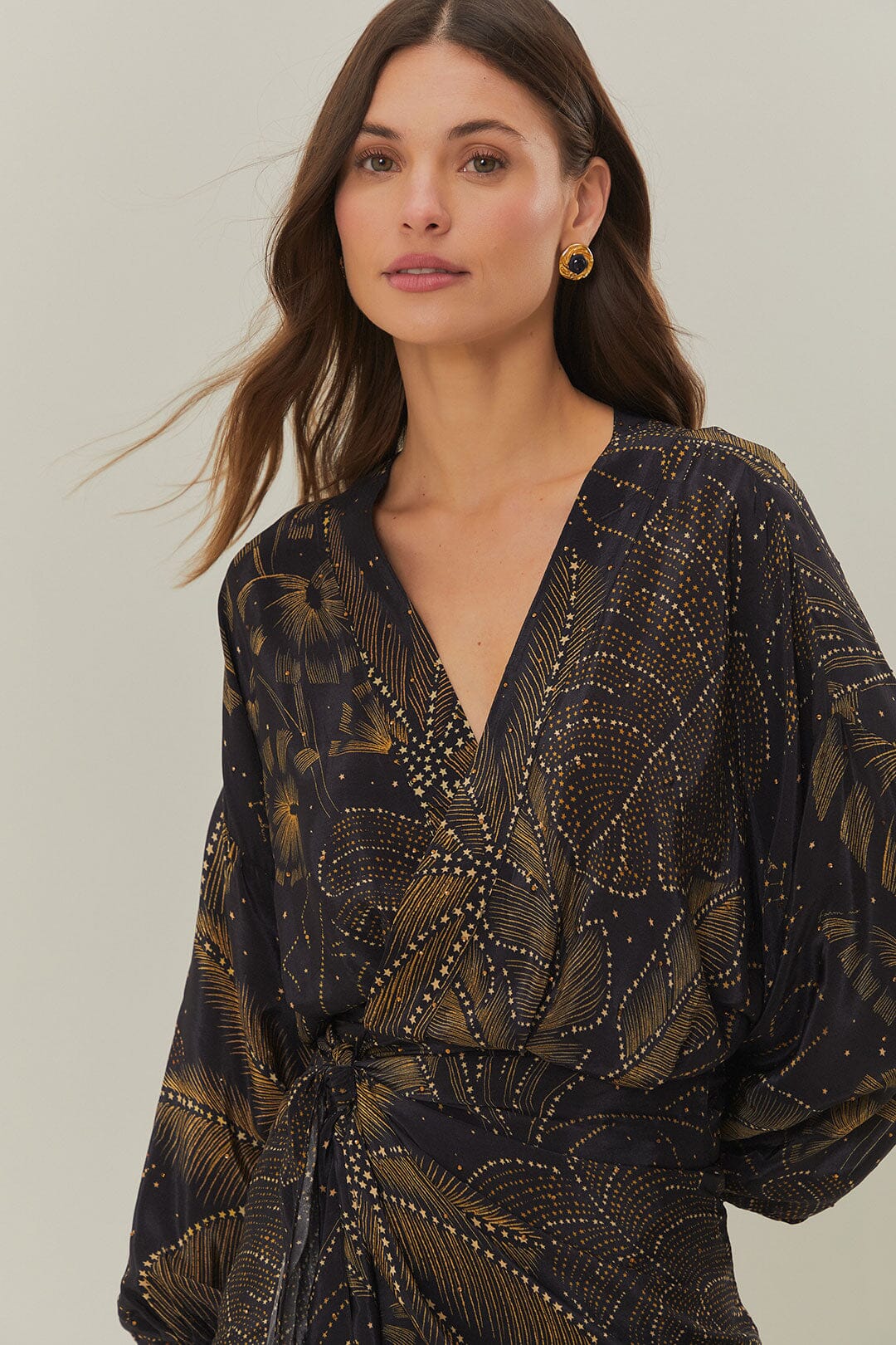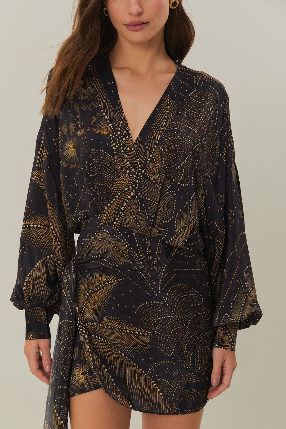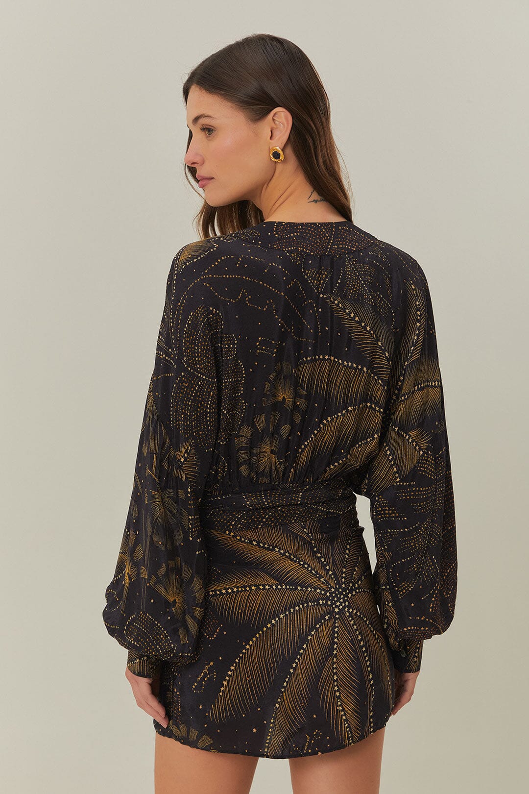 Embrace the enchanting allure of the Black Golden Foliage Mini Dress, where sophistication meets whimsy. A captivating black canvas comes alive with a lustrous golden leaf pattern that dances across the fabric. The wrap silhouette cinches delicately at the waist, flattering your figure, while the billowy sleeves add a touch of romantic flair. A plunging V neckline complements the playfully short hem, making this piece a timeless addition to your wardrobe.
