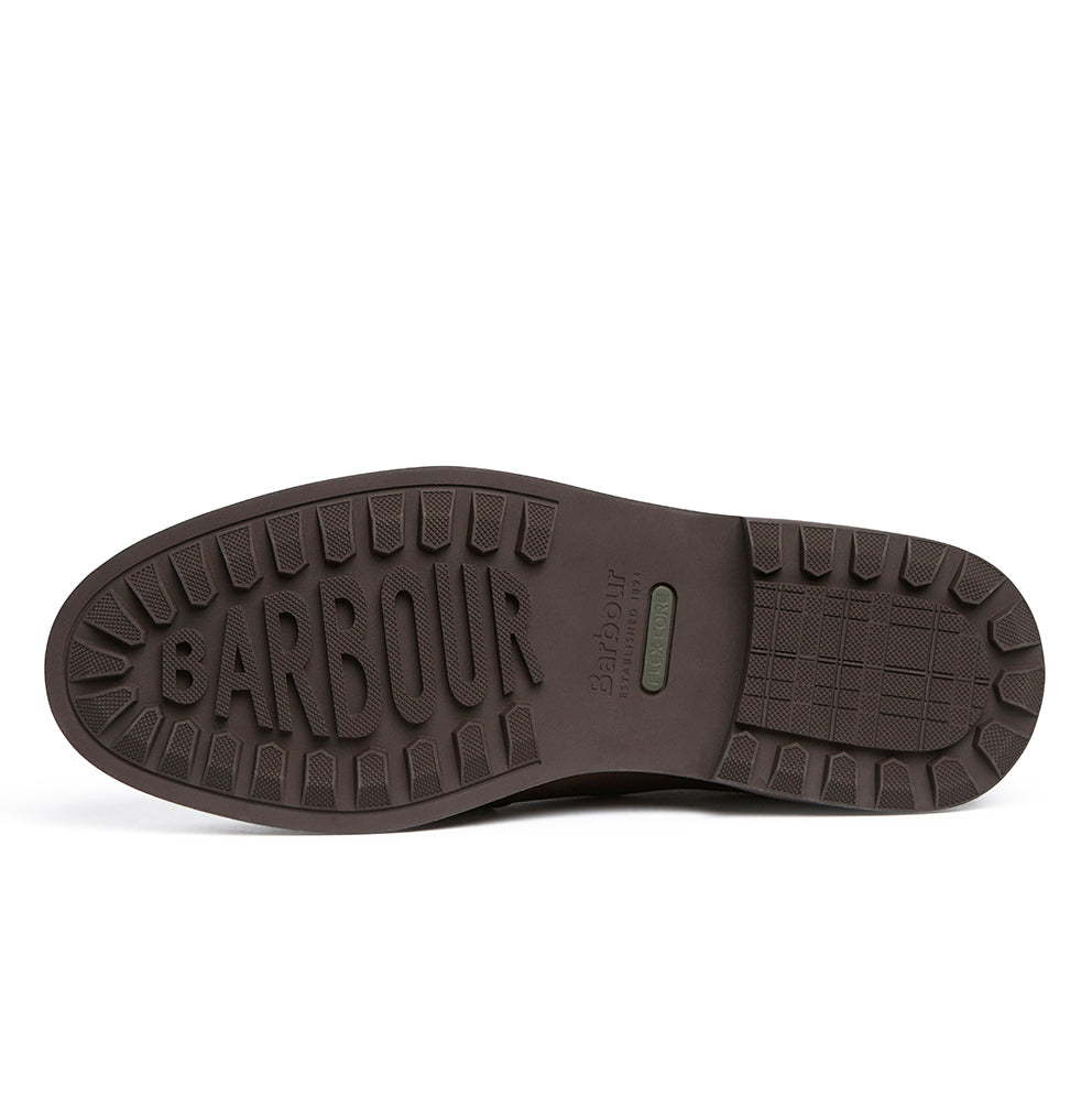 Waxed leather Dealer styled boot with exclusive Barbour rubber sole. Features Barbour woven flag, twin pull loops and back detail.