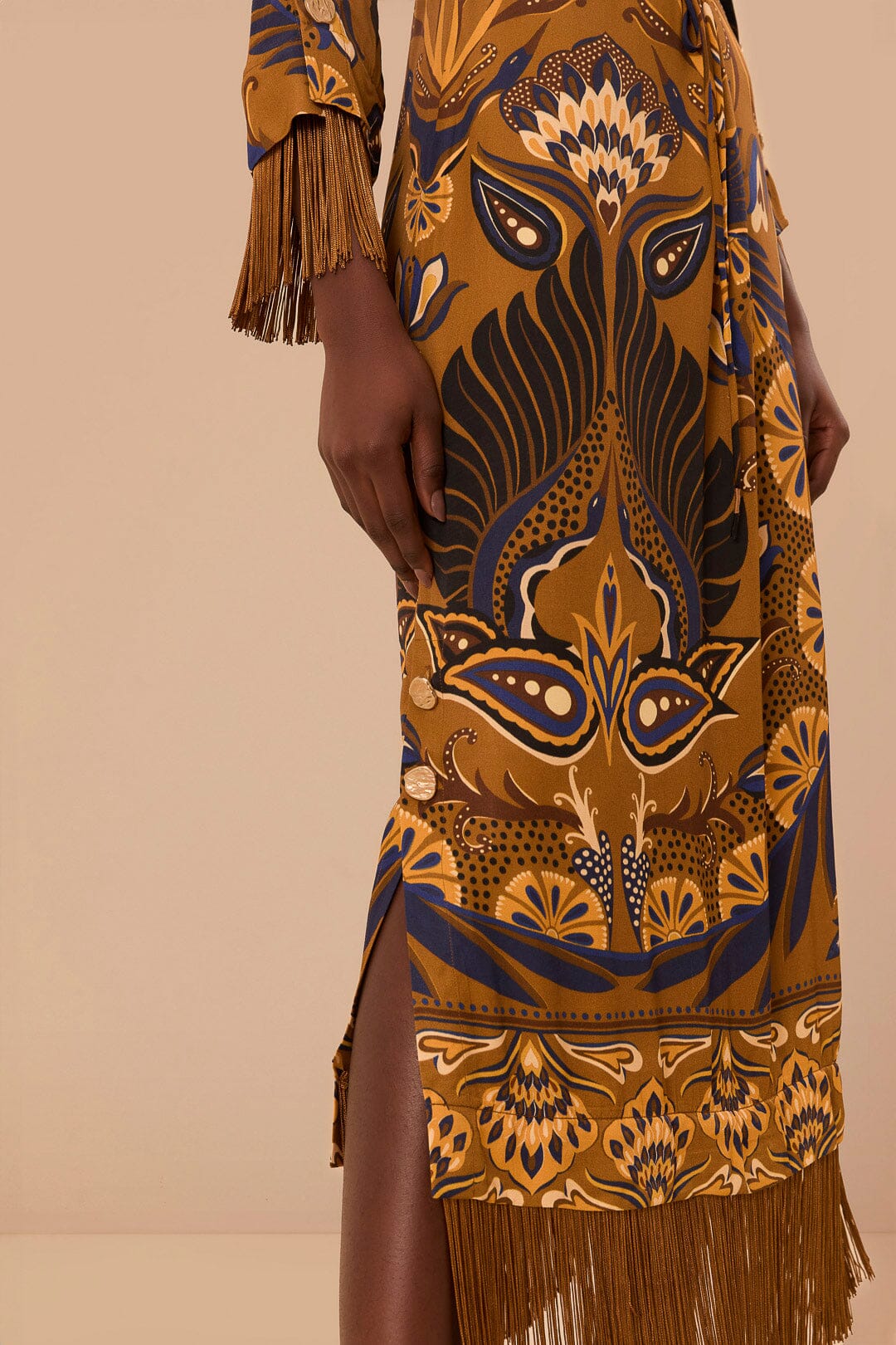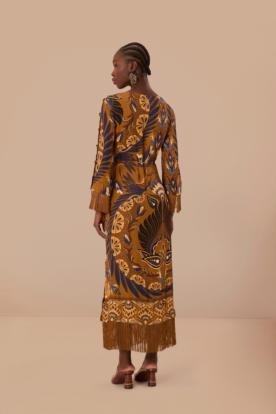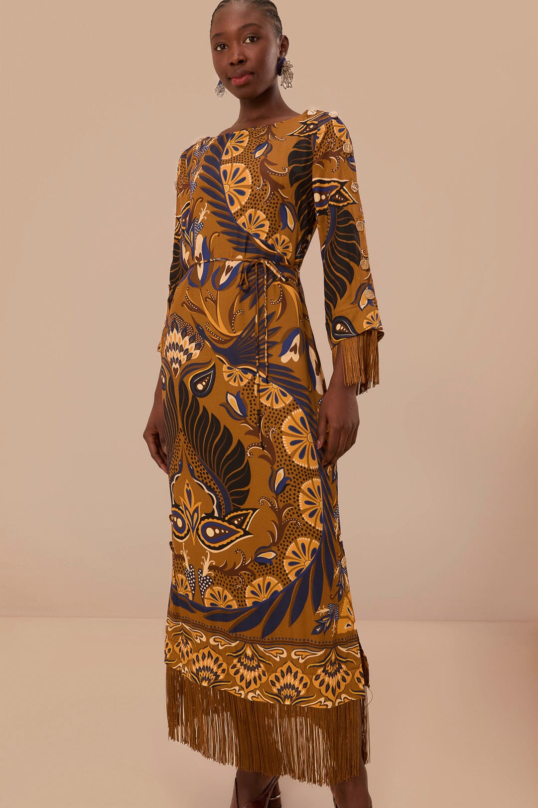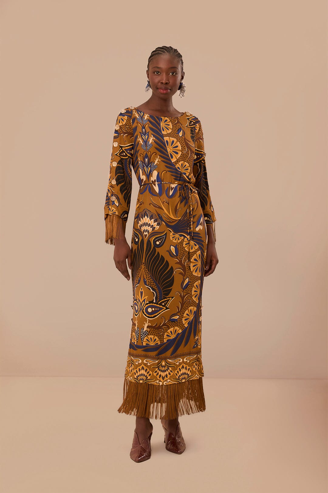 Embrace the essence of the tropics with the Gold Heart Forest Maxi Dress. This captivating piece features a harmonious blend of rich ochre and deep navy hues, adorned with an enchanting heart-infused forest print. Crafted from fluid LENZING™ ECOVERO™ viscose (50% lower emissions and water impact compared to generic viscose), the dress creates a graceful silhouette with its round neckline, gently puffed sleeves, and playful fringed hemline. A timeless creation that marries elegance with eco-conscious fabric choices for a truly heartwarming addition to your wardrobe.