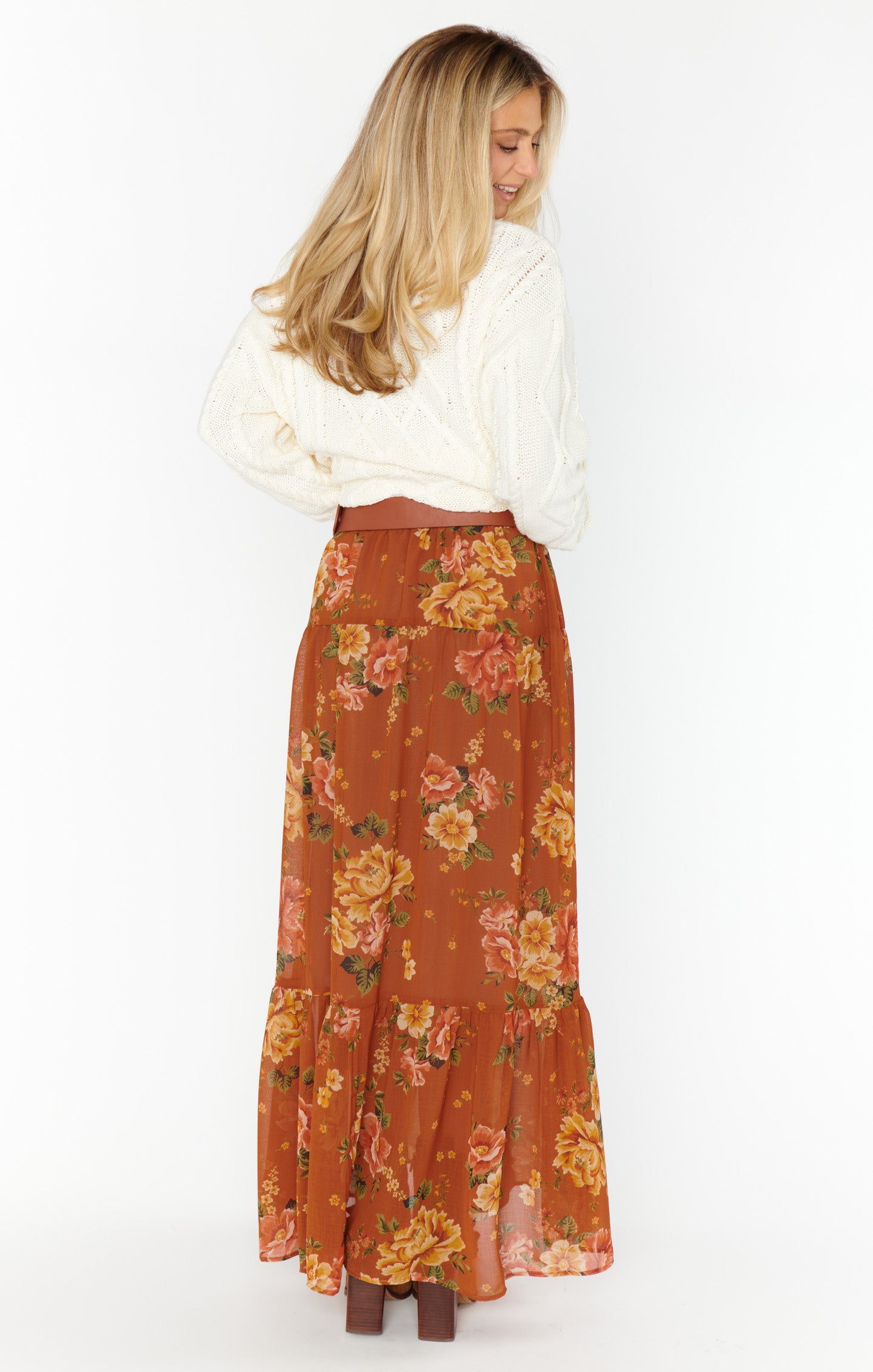 Introducing the Larina Midi Skirt by Show Me Your Mumu. This stylish midi skirt combines comfort and fashion with its flowy design and high-quality fabric. Perfect for any occasion, the Larina Midi Skirt is a must-have addition to your wardrobe. Pair with the matching Carmela button down top or with your favorite chunky knit!
