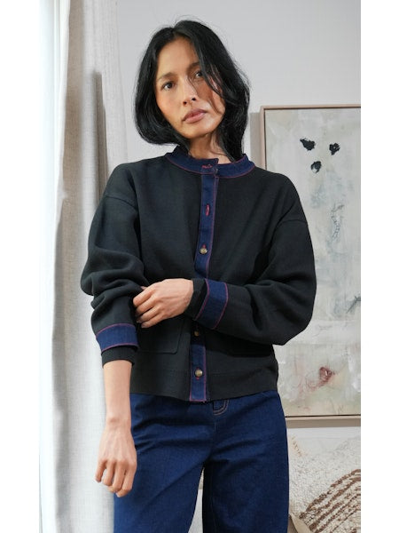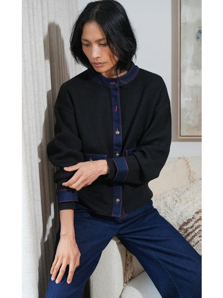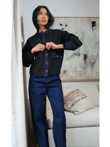 Featured in a versatile Black color, this jacket utilizes a traditional structure but incorporates unique denim detailing to give it an elevated, slightly edgy look. The jacket provides the perfect light layer for transitioning between seasons, offering a structured yet relaxed fit that pairs well with dresses, tops, or skirts.