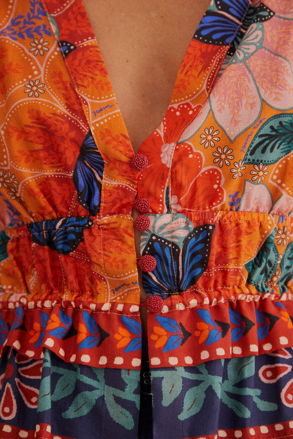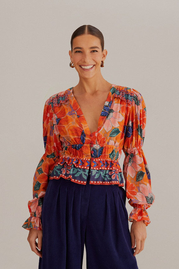 This blouse features a relaxed fit with a plunging V-neck and a center front button closure. It is adorned with ruffled accents and designed with long sleeves that have elasticized cuffs. The waistline also includes elastic for a comfortable, tailored silhouette