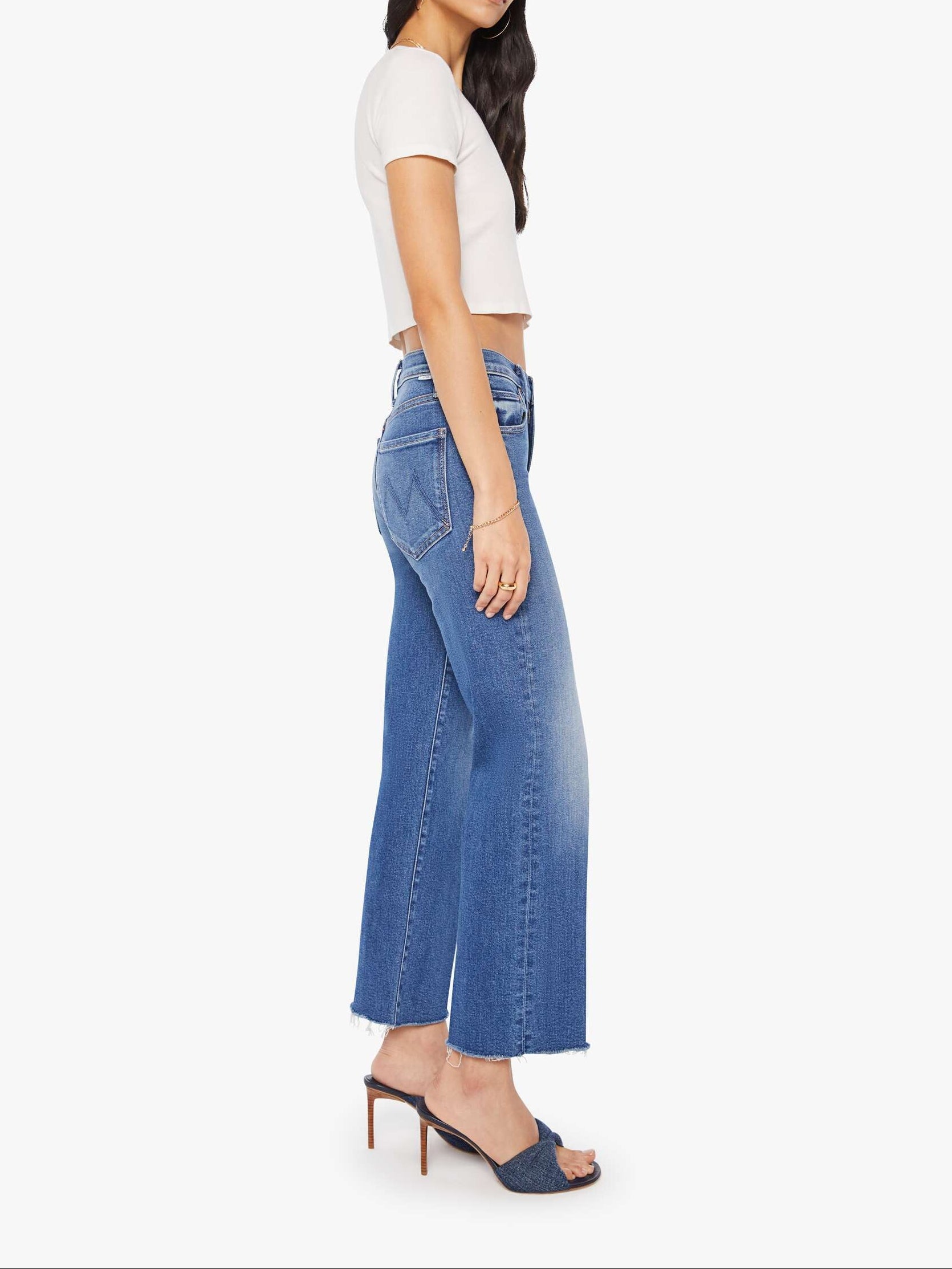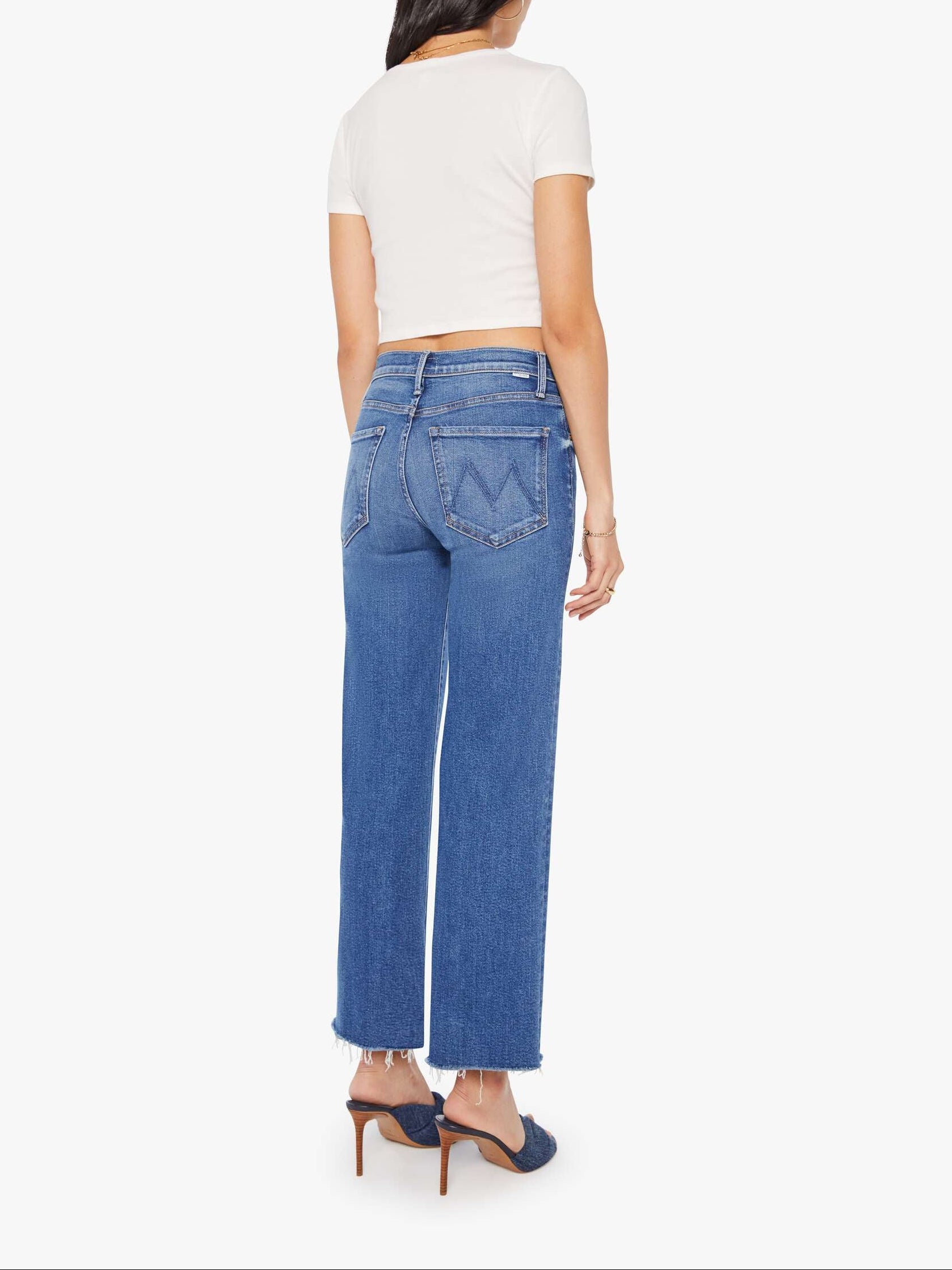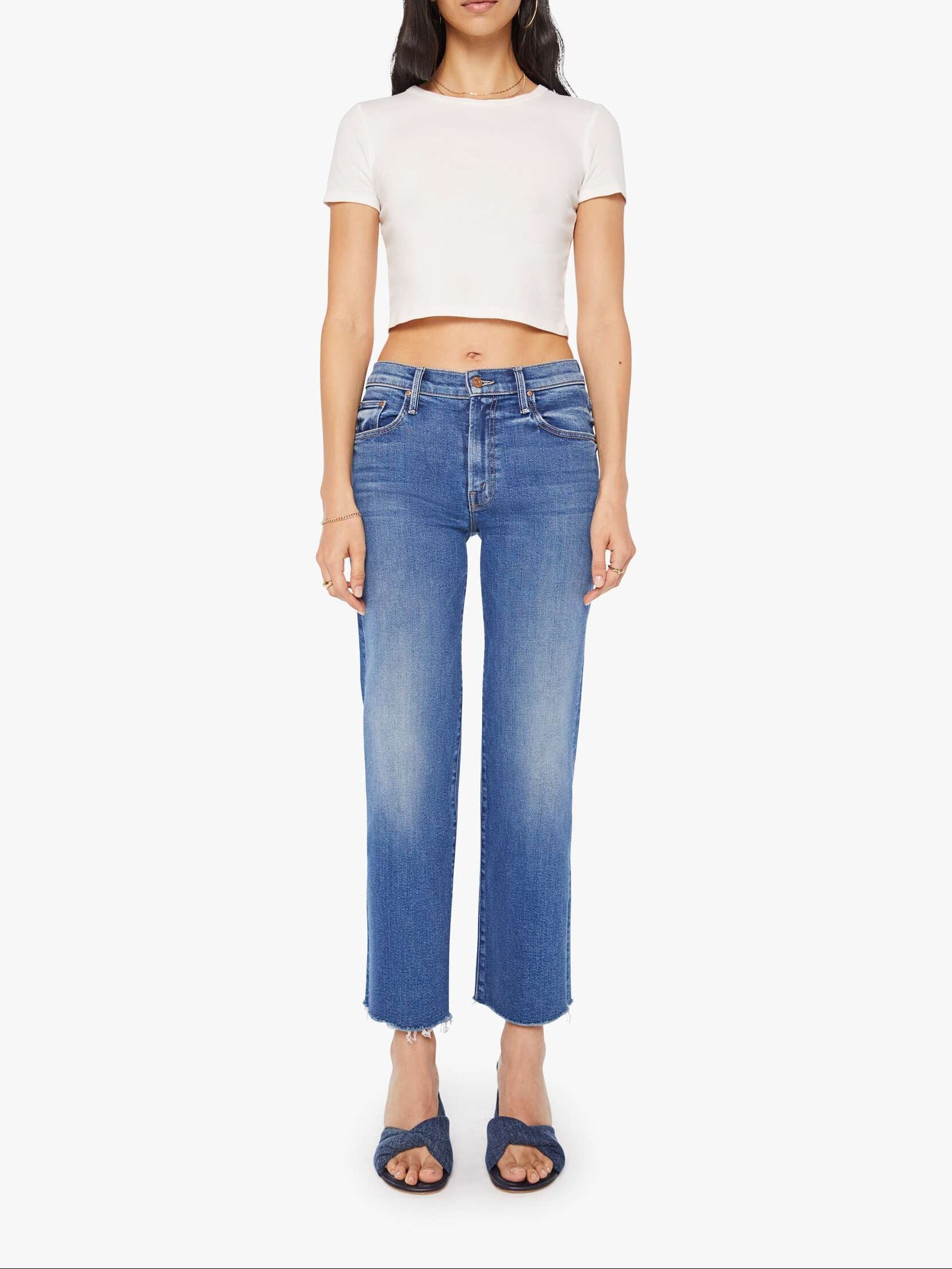 Bench warmers. Mid-rise jeans with a wide straight leg, zip fly and frayed ankle-length inseam. Made from stretch denim, Dugout Doobies is mid blue with whiskering and fading at the knee. Made in Los Angeles.
