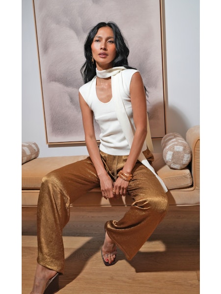 These pants are featured in a rich, eye-catching golden color, enhanced by the luxurious texture of satin fabric. The silhouette is contemporary and relaxed, featuring a dramatic wide-leg cut. Comfort is key, provided by an adjustable drawstring waist. This combination of fluid satin and a comfortable waist makes them both elegant and easy to wear.