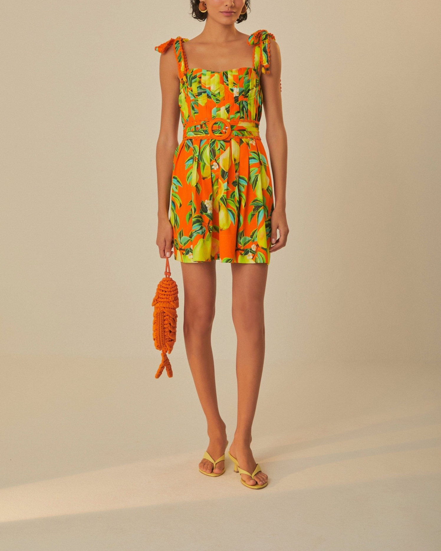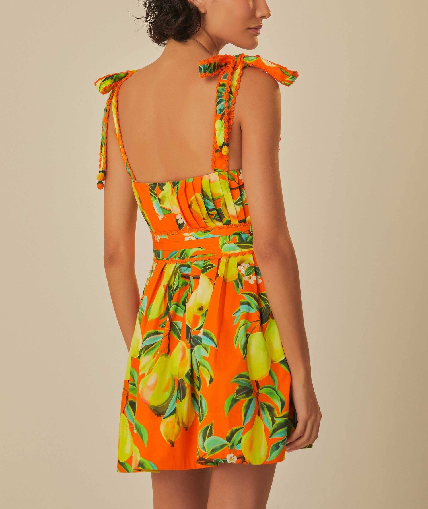 Embrace a burst of Brazilian spirit with the Orange Chic Pears Organic Cotton Mini Dress, adorned with a playful pear motif set against a vibrant orange backdrop. The sweetheart neckline flatters, leading to delicate tie-up straps and a cinched waist, showcasing the silhouette. Crafted from responsible materials, this dress features a playful skirt with just the right amount of twirl. A true celebration of joyful fashion, perfect for brightening any day.