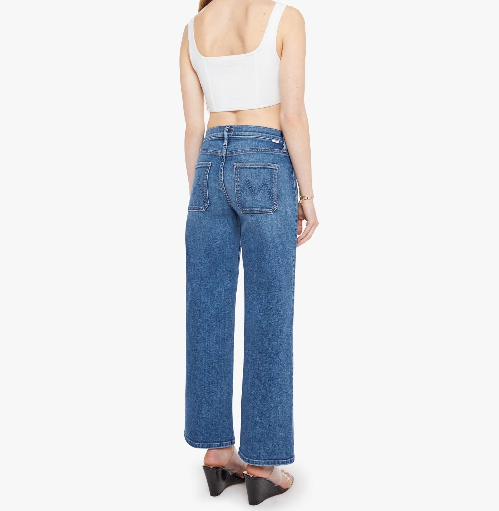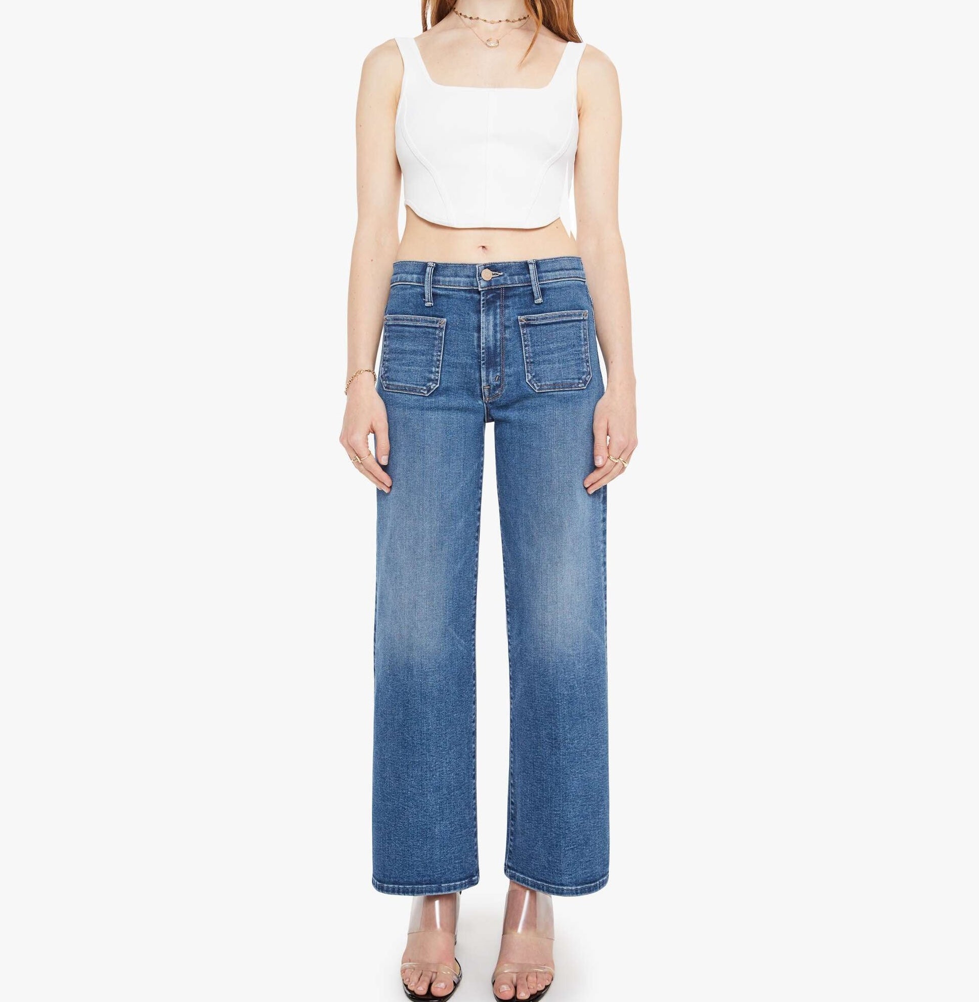 Hit the road. Mid-rise jeans with a loose fit, zip fly, wide leg, patch pockets and ankle-length inseam with a clean hem. Cut from stretch denim, Let's Split is a mid-blue with whiskering and fading at the knees.