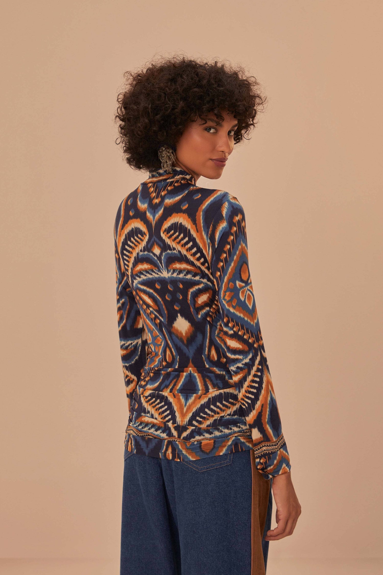 Embrace a touch of tropical flair with the Pineapple Ikat Blue Jersey Blouse, featuring a dynamic blend of bold pineapple motifs and ikat patterns in a striking blue palette. Its close-fitting silhouette and high neckline create an elegant canvas for the vibrant design, while the soft jersey fabric ensures comfort with every move.