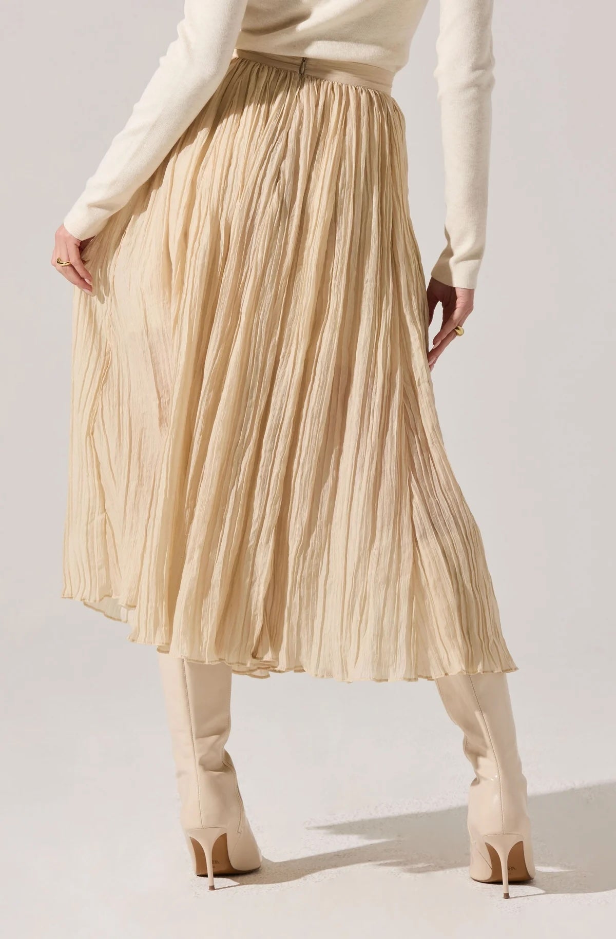 The Salome Skirt delivers a playful twist on classic elegance with its pleated flare midi silhouette. Featuring a mini skirt lining for coverage, the skirt becomes delightfully semi-sheer from the knee down, adding a hint of tease to your look. A concealed back zipper ensures a smooth fit, making this skirt perfect for twirling through your day with effortless charm.