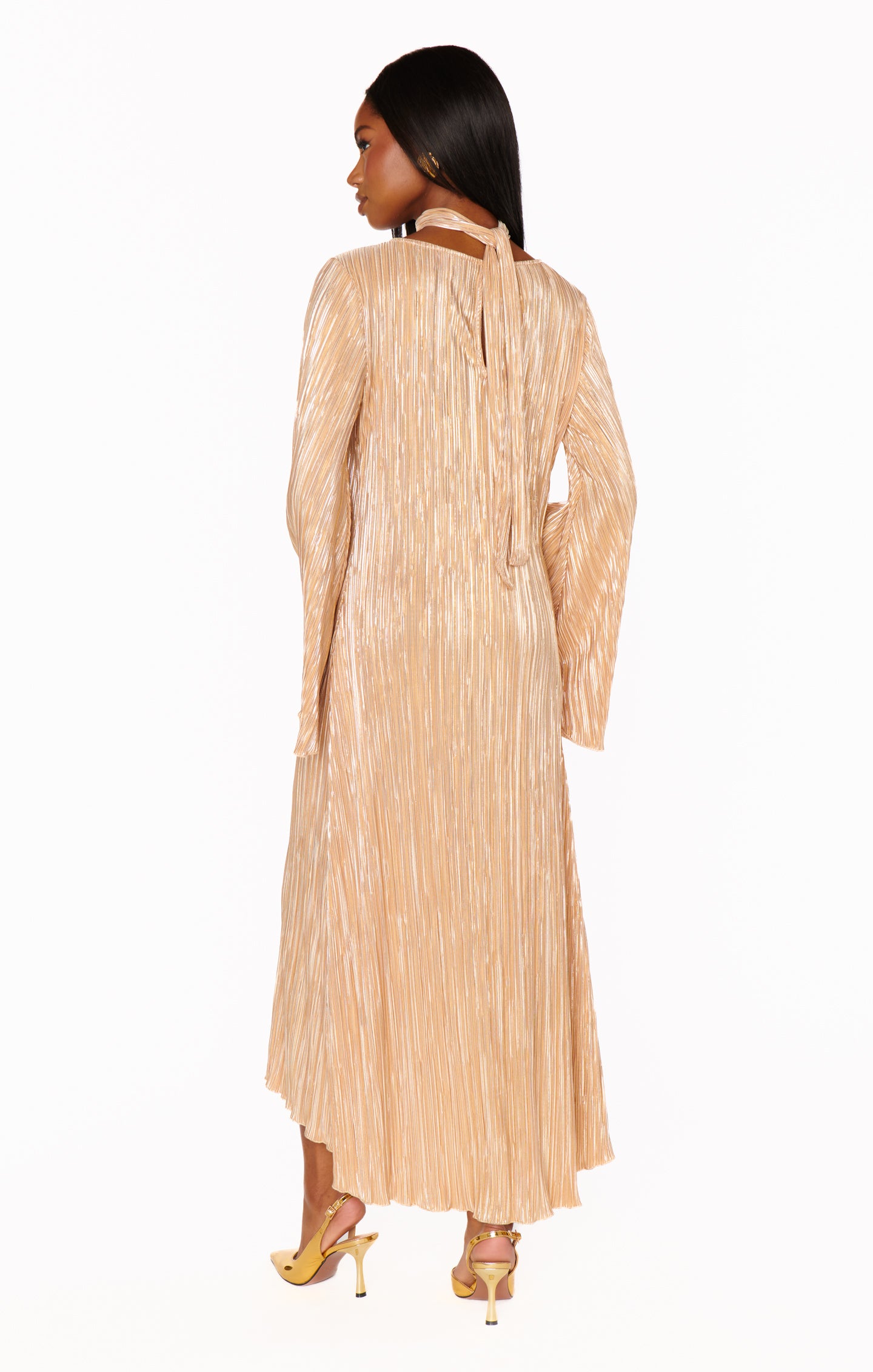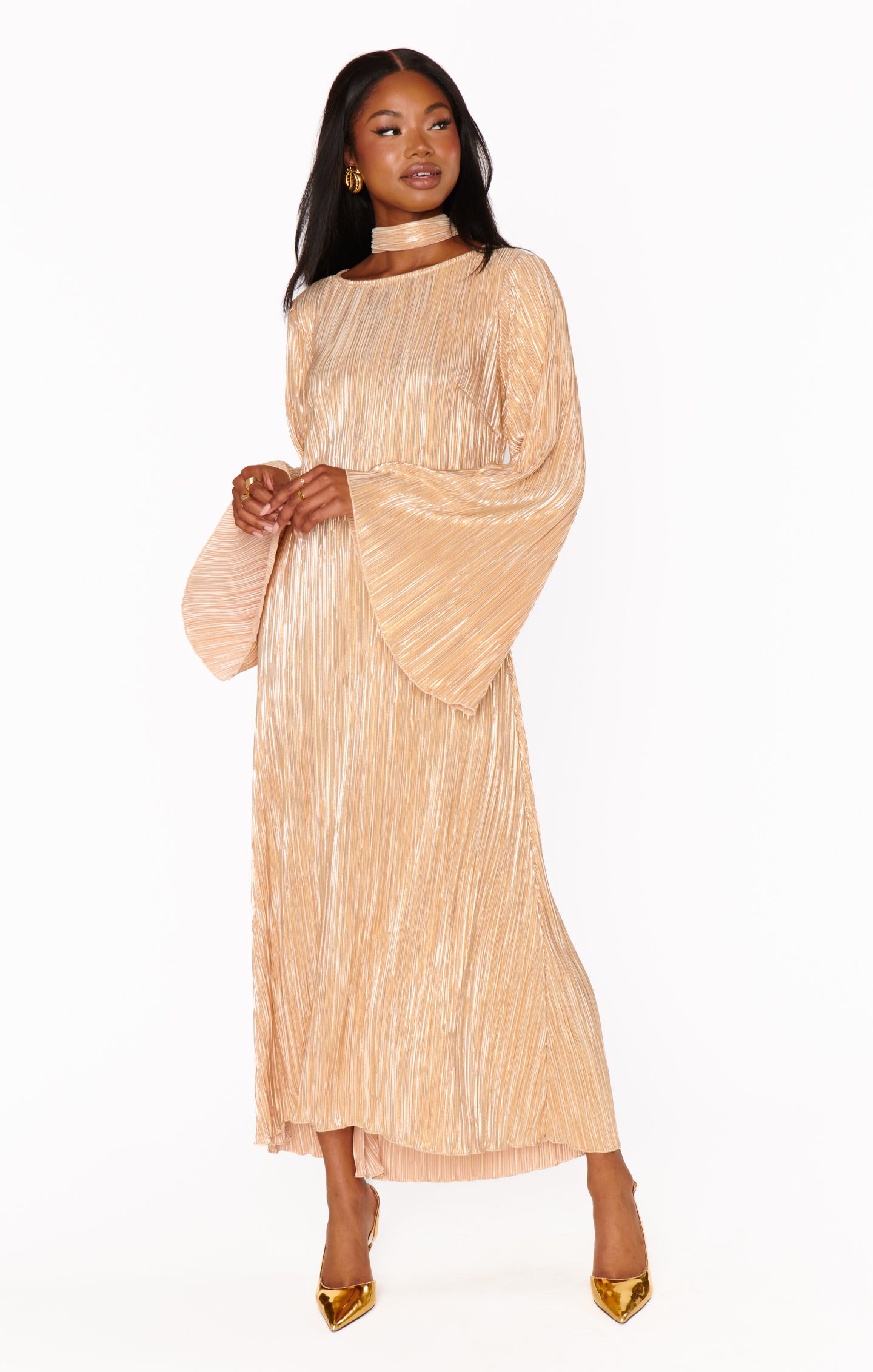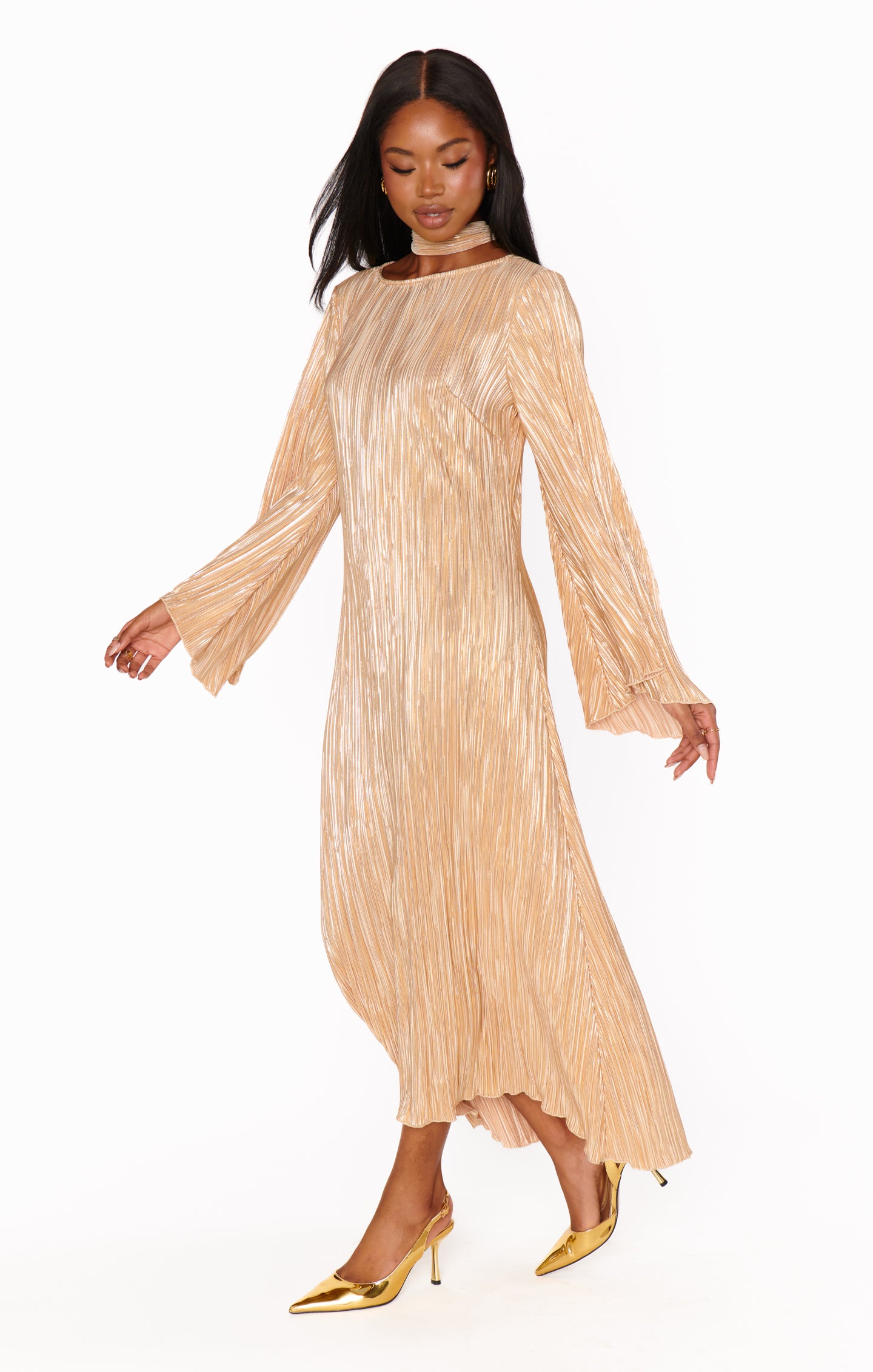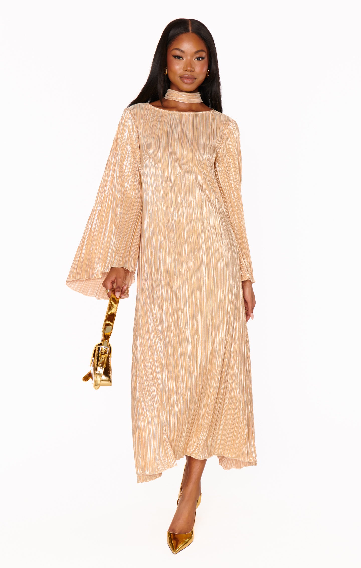 Flirty and fun yet modest in our Sarah Dress! With a playful golden pleated design, long bell sleeves and neck-tie detail, this dress highlights an effortlessly chic look.