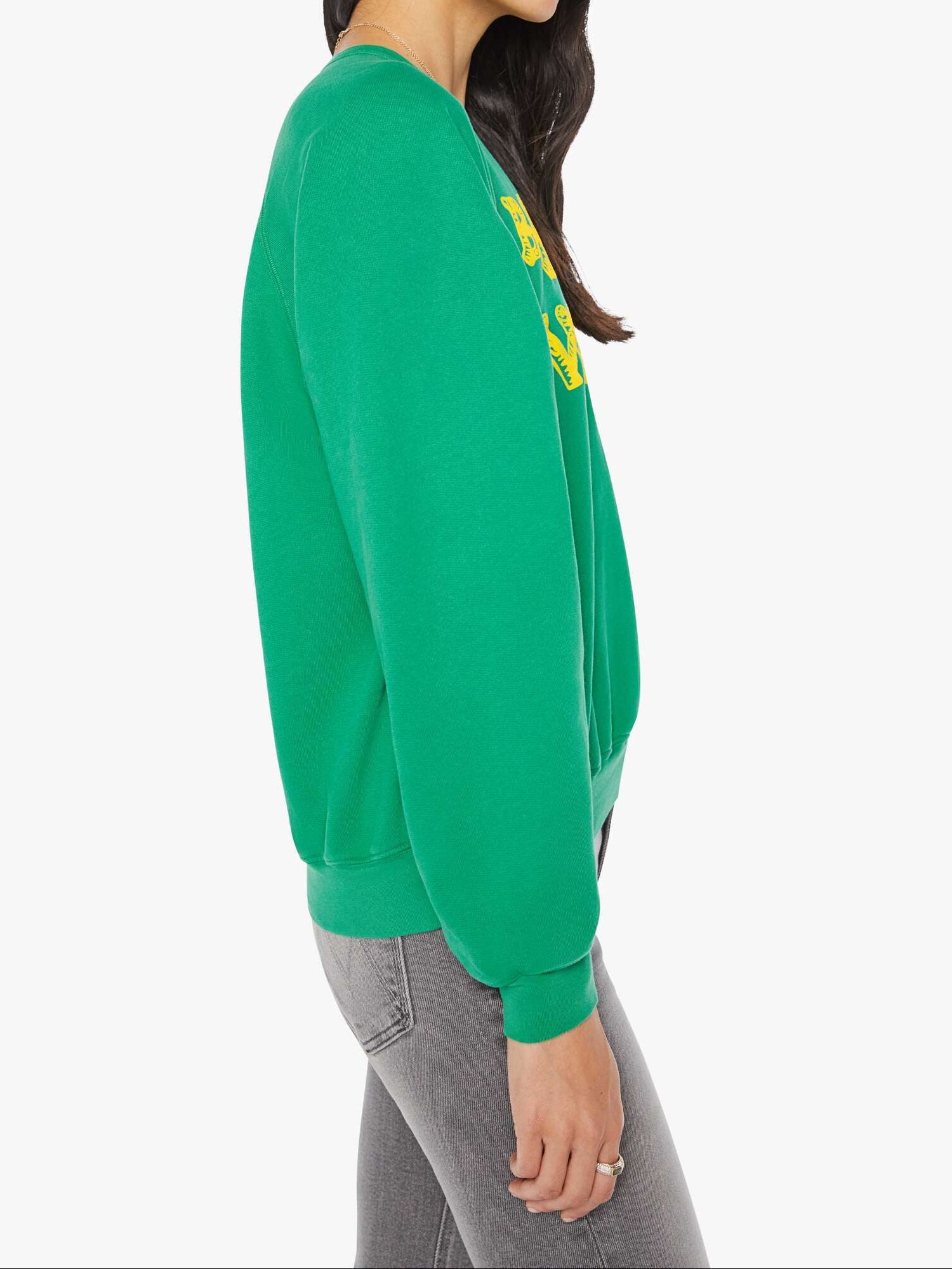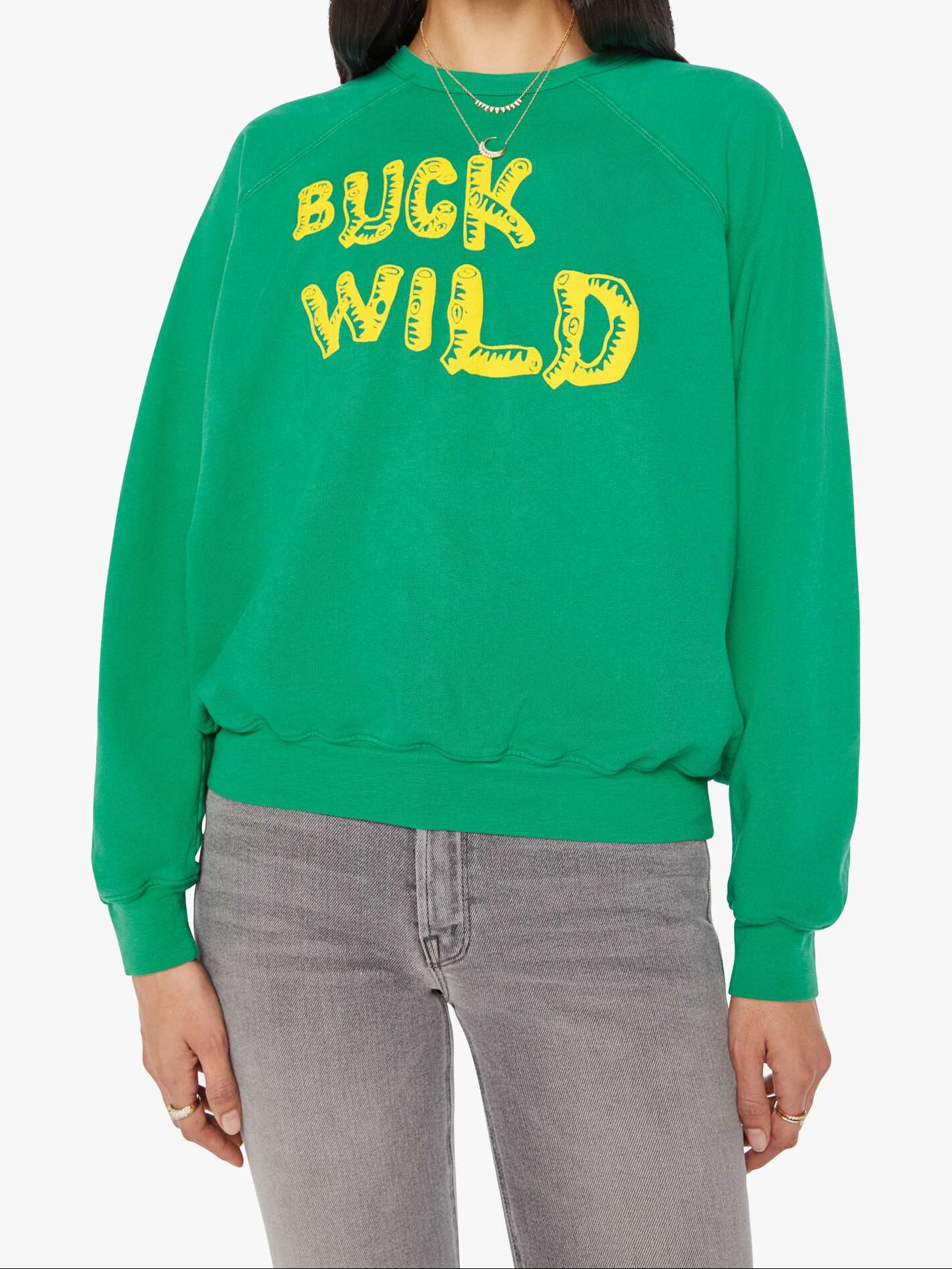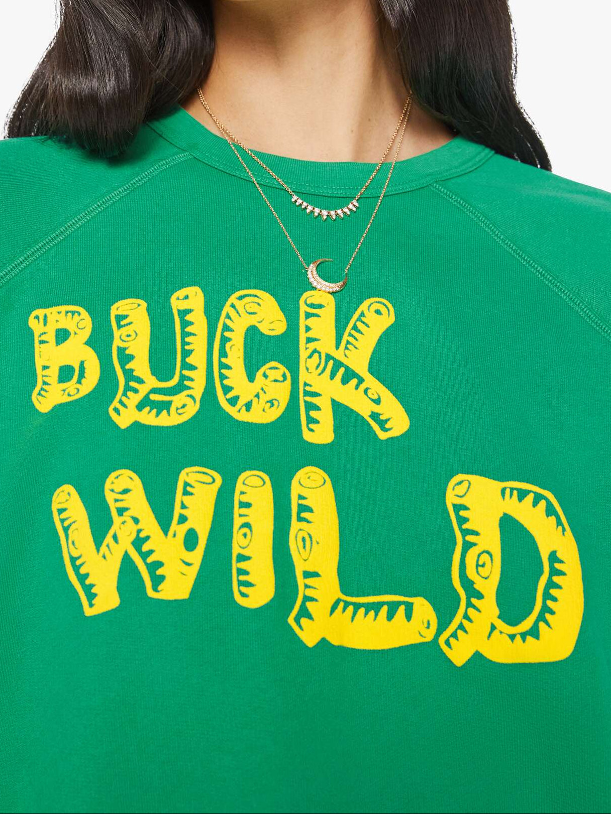 Buck wild. An oversized raglan sweatshirt with a crewneck, ribbed hems and a slightly cropped fit. Made from super-soft 100% cotton, the sweatshirt is designed in green with yellow text on the front. Made in LA.