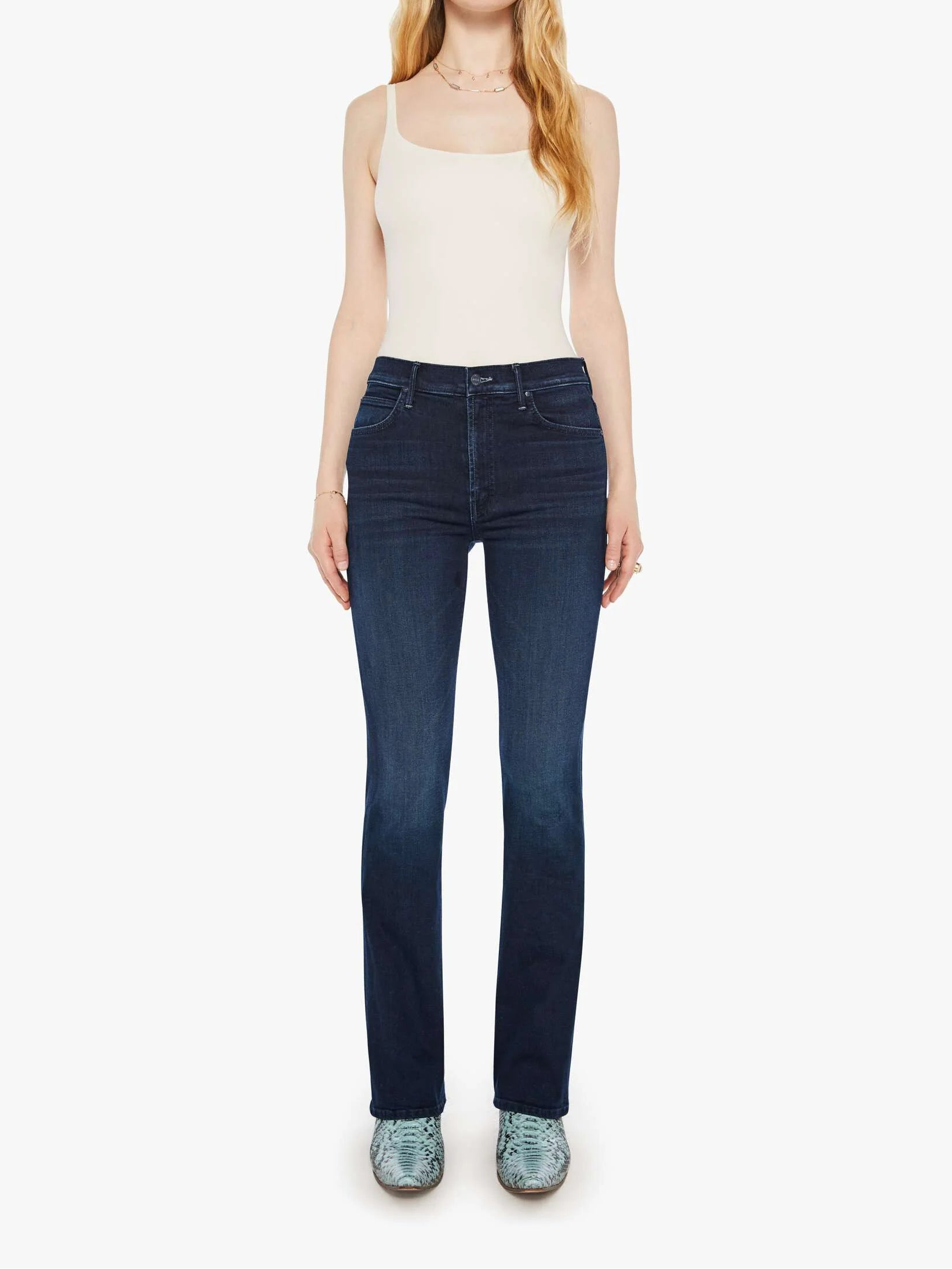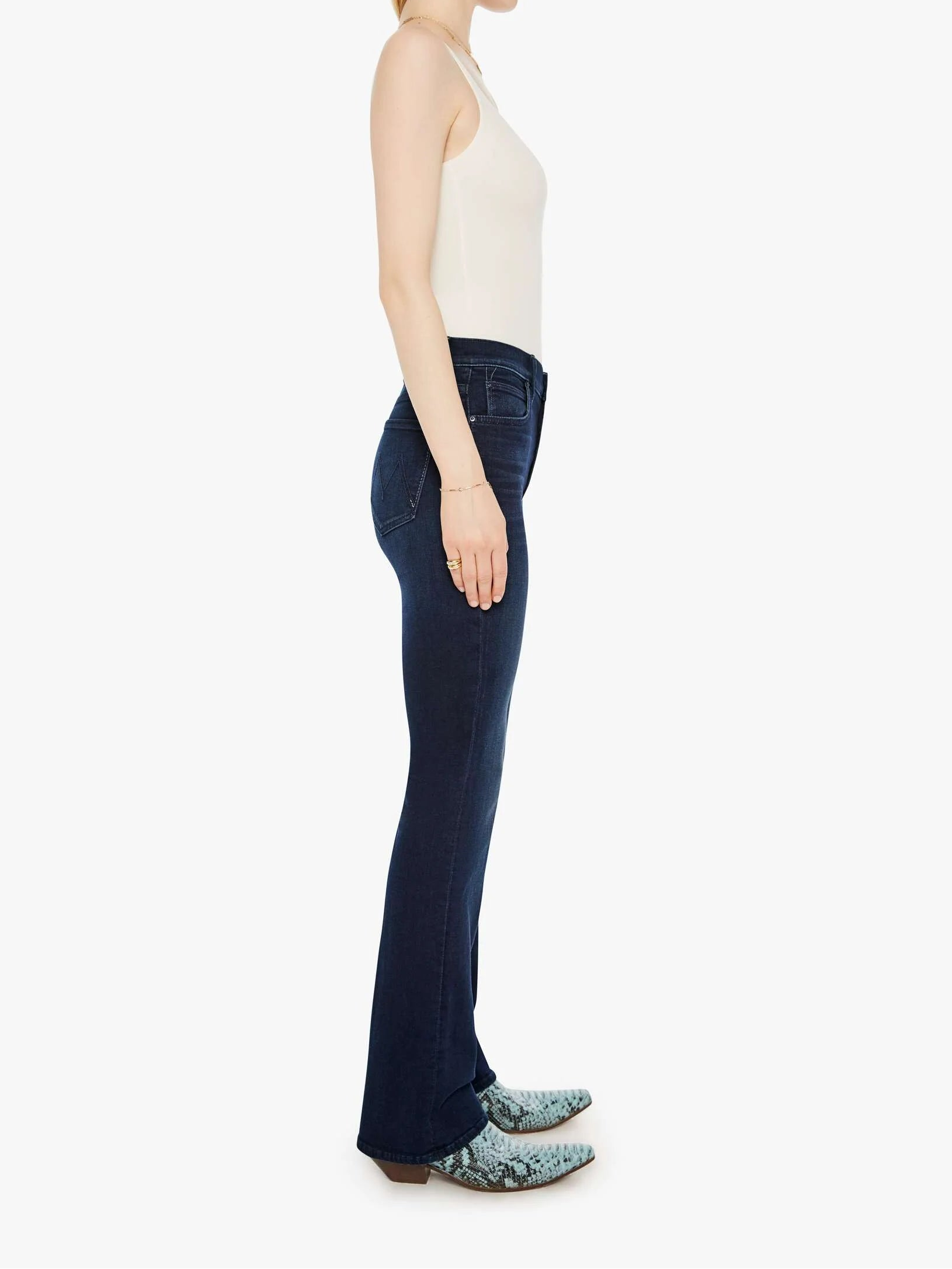 Change your tune. Mid-rise jeans with a flared leg, zip fly and a long 31-inch inseam with a clean hem. Crafted from soft stretch denim, Karaoke In Kyoto is a dark blue with subtle fading and whiskering. Made in Los Angeles utilizing fine imported materials.