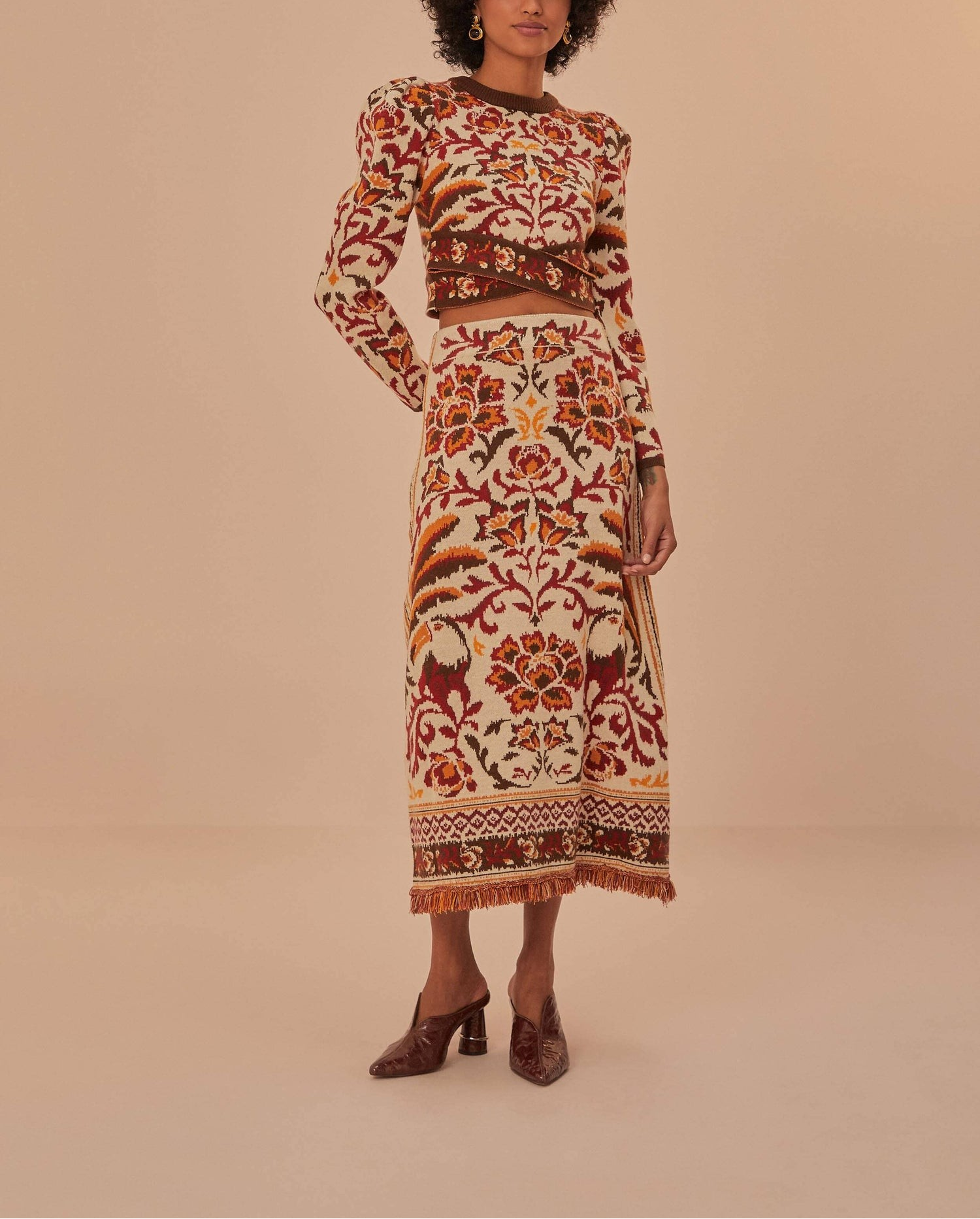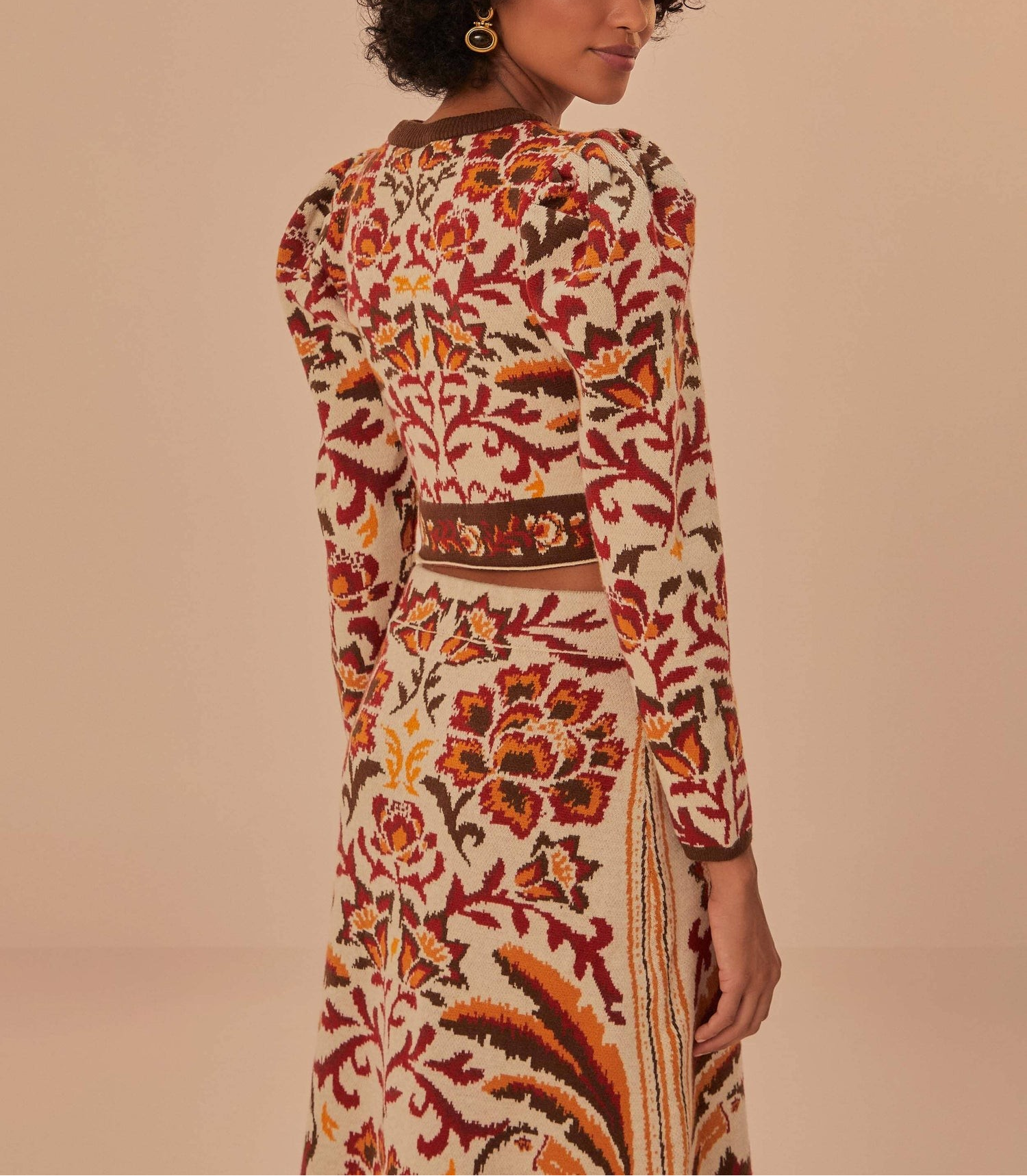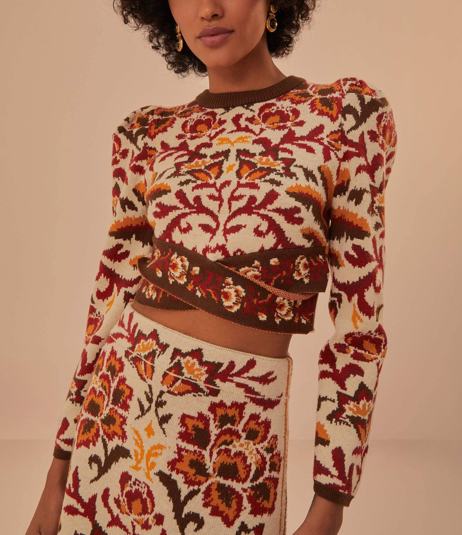 Introduce a touch of the tropics to your fall wardrobe with our Toucans Scarf Knit Top. Featuring puffed sleeves and a faux-wrap hem, this cropped knit top exudes sophistication and luxury. Pair it with the matching skirt for an elevated look all season long.