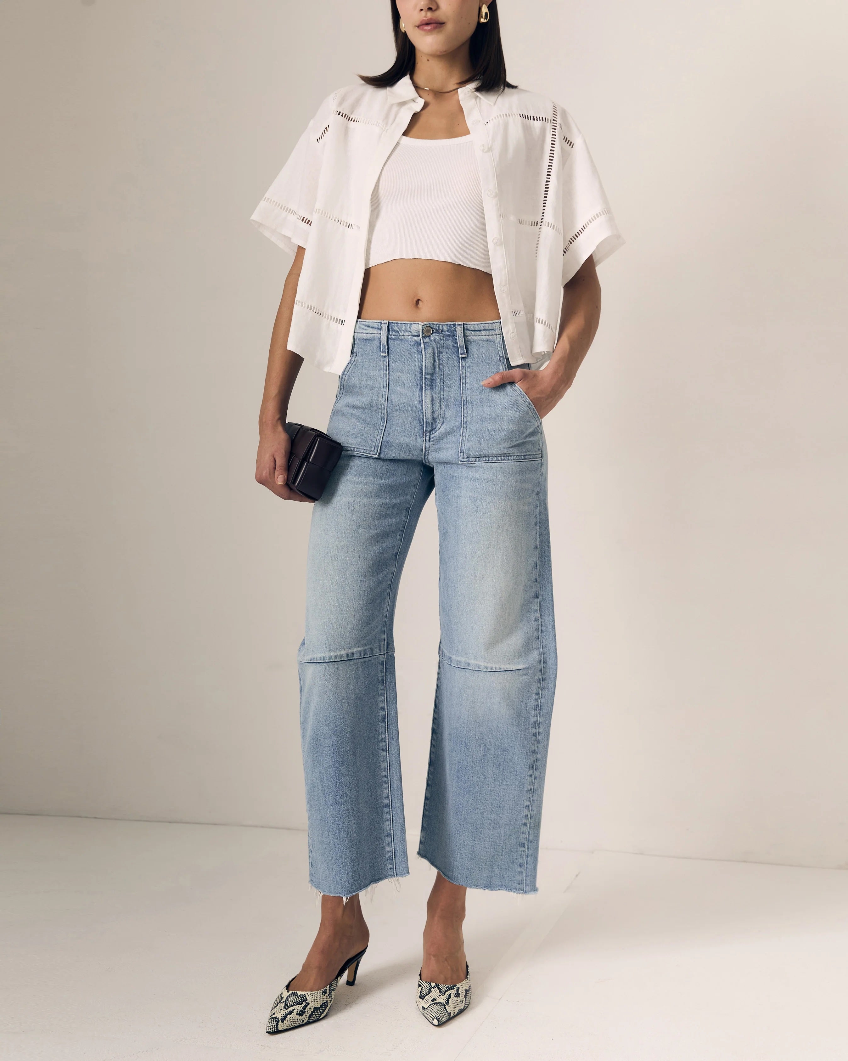 Utility Soft Barrel is a relaxed wide-straight leg with a Soft curved outseam shape. Cut from denim blended with a comfort stretch. The feminine washed blue wash makes them endlessly versatile.